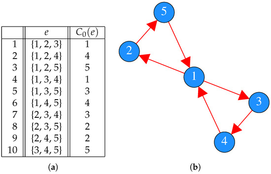 Consider the complete 3-hypergraph with choice with five vertices and 10 edges, depicted in the table in Figure 2a. Here, vertex 1 is chosen once in the presence of vertices 2 and 4 (for edges and , respectively), twice in the presence of vertex 3 (again edges and ) and never in the presence of vertex 5. Note that again, as in Example 1, each node is chosen in the case of exactly two edges.
