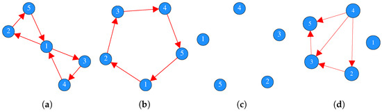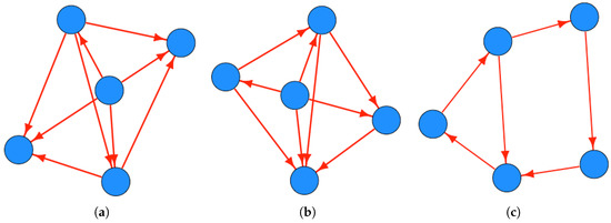 ( domination graphs.) For , we have that and the number of distinct choice functions on E is . Table 2 and Table 3 give frequency tables for the number of choice functions leading to domination graphs with a given number of edges, and a given number of strongly connected components, respectively. Note that 3348 choice functions result in strongly connected domination graphs. There are 225 non-isomorphic -domination graphs (of which 21 are strongly connected); plots of these are provided in the Supplementary Materials; Table 4 gives the frequencies for these graphs. The two most frequent domination graphs (each occurring for 1560 distinct choice functions, C), are given in Figure 4a,b respectively; the most frequently occurring strongly connected domination graph is given in Figure 4c.