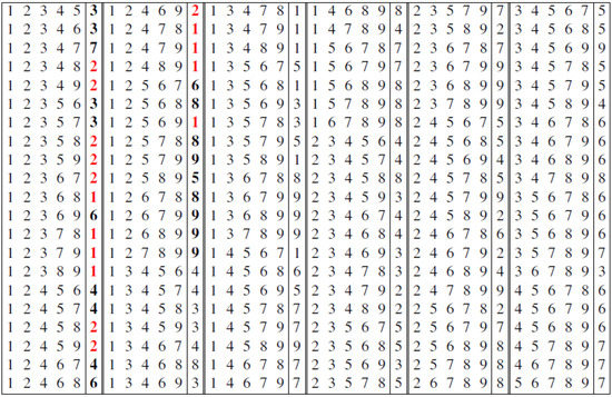 A (9,5)-choice hypergraph resulting in a zero-edge domination graph. For a given , the value of is listed to the right of the five elements of e in a demarcated column.