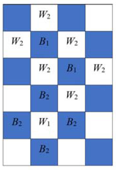 For convenience, it is assumed that B1 and B2 can be located at position (i,j), where (i + j) mod 2 = 0. Similarly, the elements of W1 and W2 can be located at position (i + j), where (i + j) mod 2 = 1 as shown in Figure 3. In the first round, according to the data-hiding key, pixel Ii,j is selected, and pixel Ii,j is assigned to B1 or W1, if (i + j) mod 2 is 0 or 1, respectively. Then, neighboring pixels Ii+1,j, Ii−1,j, Ii,j+1, and Ii,j-1 are assigned to W2 or B2, respectively. For the next round, we choose a new pixel Ii,j with i and j that are different from i and j in the previous round. If (i + j) mod 2 is 0, then the chosen pixel Ii,j becomes an element in B1, regardless of whether the chosen pixel Ii,j is an element of B2 or not, and neighboring pixels Ii+1,j, Ii−1,j, Ii,j+1, and Ii,j−1 are elements of W1 or W2 or not. However, the neighboring pixels that are not in W2 become elements in W2. The neighboring pixels in W1 or W2 are not changed. Similarly, if (i + j) mod 2 = 1, then the chosen pixel Ii,j is assigned to set W1, and the neighboring pixels not in set B2, become elements of B2. For example, as shown in Figure 3, we choose a pixel at position (2, 2) where i = 2 and j = 2. Since (2 + 2) mod 2 = 0, the first chosen pixel belongs to set B1 and neighboring pixels will be the elements in set W2. If the second selected pixel is located at the (3, 3) position, the chosen pixel belongs to set B1 since (3 + 3) mod 2 = 0. Since the top and left pixels are already in set W2, only the bottom and right pixels will be the elements in set W2. The third chosen pixel at position (5, 2) will belong to set W1 as (5 + 2) mod 2 = 1 and adjacent pixels will be the elements in B2. The next pixel can be selected at position (4, 3) and will belong to set W1. Though this pixel was already an element of set W2, the pixel can belong to W1 and the neighboring pixels that are not in B2 become the elements of B2. The selection process terminates when the elements of B1 and W1 become QBG and QWG.