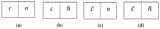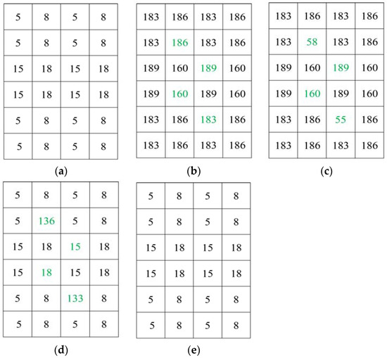 On the basis of statistics, as shown in Figure 4a,b, the absolute difference value of c and its neighboring pixel is 1 2 ( | c n | + | c n ¯ | ) ; the absolute difference value of c ¯ and its neighboring pixel is 1 2 ( | c ¯ n | + | c ¯ n ¯ | ) as depicted in Figure 4c,d. The net difference of the above two values is