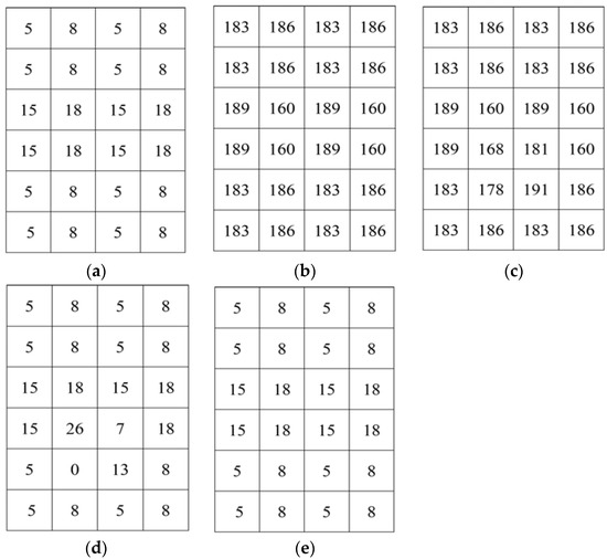 To illustrate our proposed joint data hiding system, a simple example is considered. Let I be the original image of size 4 × 6, as shown in Figure 5a. First, I is encrypted by using the encryption key and encrypted image I’ is obtained, as demonstrated in Figure 5b. Then, the information bits are embedded into I’. It is assumed that t = 4. We consider Q = 4, the four bits to be embedded are 1001 and after permutation the permuted bits, A = 0101. Here, QB = 2 and QW = 2. Let G = 2, i.e., two pixels are required to embed one bit. I’ is divided into four sets B1, B2, W1, and W2. Border pixels can be the elements of B2 or W2 but cannot be the elements of B1 or W1. Let the first chosen pixel be 186 at position (2, 2) where i = 2 and j = 2. Since (2 + 2) mod 2 = 0, this pixel will belong to set B1 and neighboring pixels {186,183,160,183} will be the elements in set W2. The second pixel, 189 at (3, 3), will belong to set B1 as (3 + 3) mod 2 = 0, and as top and left pixels {183,160} are already in set W2, only bottom and right pixels {189,160} will be the elements in set W2. The third pixel, 183 at position (3, 2), will belong to set W1 as (3 + 2) mod 2 = 1, and neighboring pixels {183,186,189,186} will be elements in B2. The process is continued until number of pixels in B1 and W1 exceeds 4. Let B1 and W1 be B1 = {186,189,160,183} and W1 = {183,160,189,186},respectively.Therefore, C is determined as C = {186,189,160,183,183,160,189,186}. These pixels are divided into four groups and each group contains two pixels. If it is assumed that the first group is {186,189} and first bit to be embedded is 0, the pixels in this group will be the same. If the second group is {160,183} and bit to be embedded is 1, then t th bit of all pixels in this group is flipped. Thus, after embedding all the bits, embedded encrypted image is shown in Figure 5c.