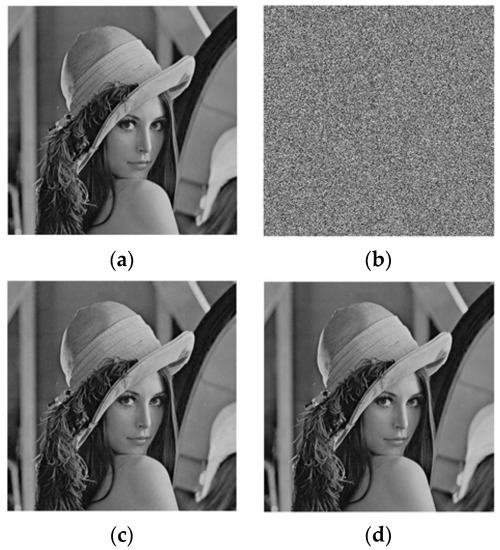 Figure 9. Experiment by joint system. (a) Original Lena; (b) encrypted Lena; (c) decrypted Lena containing information bits; and (d) recovered Lena.