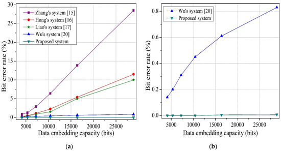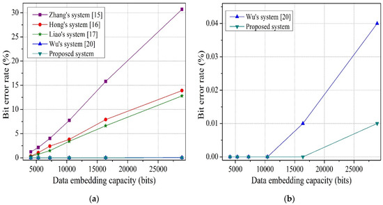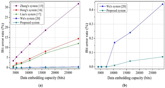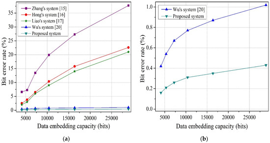 Figure 14. BER comparison between the proposed system and the referenced systems for the test image Sailboat. (a) Comparison of systems mentioned. (b) Comparison of proposed system and Wu and Sun.