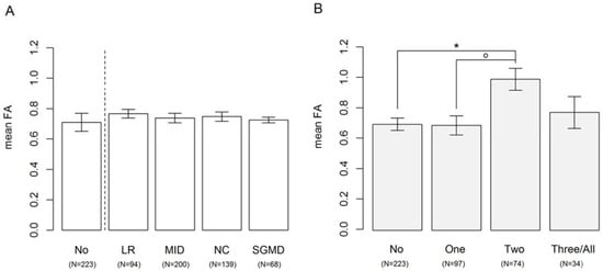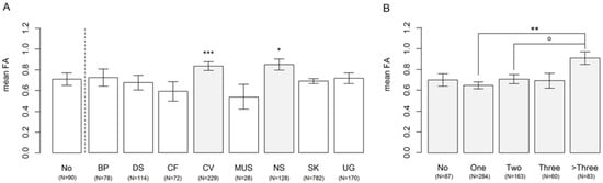 (A) Mean limb fluctuating asymmetry (FA) (non-standardized) in fetuses with abnormalities in the different organ systems. The level of FA in fetuses with no abnormalities in the organ systems was depicted for comparison (left of the dashed line). Fetuses with cardiovascular and nervous system malformations had significantly higher limb FA than fetuses without congenital abnormalities in the organ systems (F1,760 = 12.84, p < 0.001 and F1,760 = 5.78, p < 0.05, respectively). All other organ system defects were not significantly correlated by limb FA compared to fetuses with no abnormalities; (B) FA increased in fetuses with more than three malformed organ systems. Fetuses with congenital abnormalities in more than three organ systems had significantly increased fluctuating asymmetry compared to fetuses with, one malformed organ system (p < 0.01). Fetuses with more than three malformed organ systems tended to have significantly higher limb FA than fetuses with two malformed organ systems (p = 0.09). All other pairwise comparisons between the numbers of malformed organ systems showed no significant difference (0.21 < p < 1.00). o = p-value < 0.1, ** = p-value < 0.01. BP: bronchopulmonary malformations; DS: digestive system malformations; CF: craniofacial malformations; CV: cardiovascular malformations; MUS: mesoderm malformations including muscular system malformations; NS ectoderm malformations including nervous system defects; SK: skeletal malformations; UG: urogenital malformations.