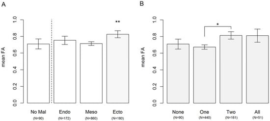 (A) Mean fluctuating asymmetry (not standardized) increased in fetuses with ectoderm abnormalities. The level of FA of fetuses without malformations was depicted for comparison. Fetuses suffering congenital abnormalities in the ectoderm (Ecto) had significantly higher FA than fetuses with no congenital abnormalities (F1,809 = 8.03, p < 0.01). Fetuses with abnormalities in the endoderm (Endo) or mesoderm (Meso) did not have higher FA than fetuses without congenital abnormalities (F1,777 = 2.05, p = 0.15 and F1,726 = 0.17, p = 0.68, respectively); (B) Relationship with the number of malformed germ layers and FA are not clear/No significant correlation between the number of malformed germ layers and FA. Fetuses with two malformed organ systems had significantly higher FA than fetuses with one malformed germ layer (p < 0.05). All other pairwise comparisons between the numbers of malformed organ systems did not differ significantly so (0.42 < p < 1.00). * = p-value < 0.05, ** = p-value < 0.01.