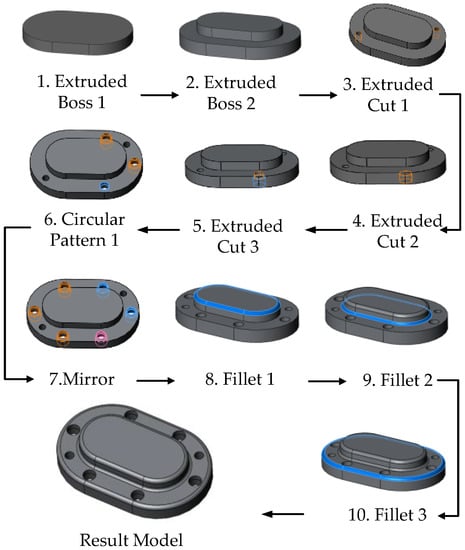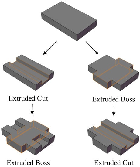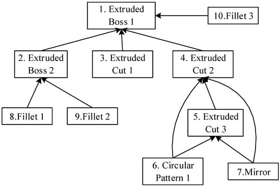 - Modeling features have a dependent relationship. Therefore, operations executed on features with dependency should follow the dependent relationship to keep a valid modeling procedure. As shown in Figure 5, the extruded cut feature depends on the initial boss feature. So, in the modeling procedure, the extruded cut must be executed after the creation of the boss feature. Otherwise, the cut operation is meaningless and non-executable.