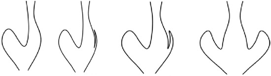 These four images are generated from the same pair of 3D mirror symmetric curves but seen from different vantage points. On the far left, the viewing angle is such that the curve images do not suggest 3D symmetry. Nonetheless, the relationship is there, and it becomes clear as the view is rotated, especially in the two right-most images. These images were published in [28].