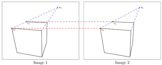 Sometimes, we need to refer to the reprojection error of an image point relative to some estimate of a 3D point. For example, point may be imaged in camera 1 as point , but with some errors. In this case, the reprojection error is expressed as: . For those unfamiliar with homogeneous coordinates, camera matrices, and projective spaces, please refer to Hartley and Zisserman [22].