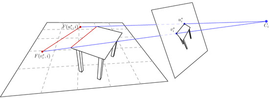 We use the Harris operator [52] with parameters set to over detect corner features. Corner features are then registered with each other across both input images using the disparity map previously calculated when finding the floor prior. Let be the equation for the floor, where is suggestive of the direction of gravity. Let be an image point in camera i. Equation (5) is the ray-plane intersection that denotes the point on the floor plane that images to . This situation is illustrated in Figure 5: