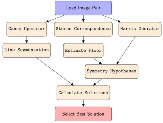 where is every pair of corner features registered across both images by the disparity map calculated in Section 3.4, is the resulting symmetry plane found by solving Equations (6) and (7), and gives the two solutions for Equations (2) and (3) in camera image i. This operation has worst time complexity in the number of corner features detected, since we are testing all unique sets of two corner features chosen from the set of all detected corner features.