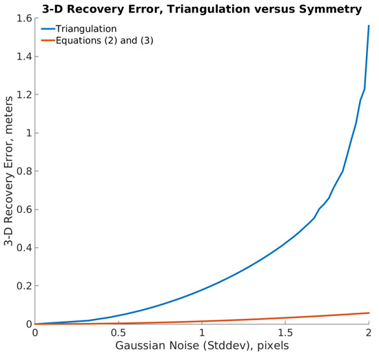 Figure 7 clearly shows that 3D recovery using Triangulation is more sensitive to noise, which could come from image pixelation, or other aspects of camera system, such as uncorrected lens distortion. Recovery using Equations (2) and (3) was more than an order of magnitude more accurate at all levels of noise, except zero noise, when recovery was identical for both methods.