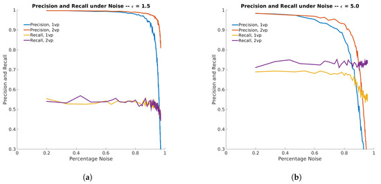 Precision and recall scores as a function of the percentage of noise features in the input images, for randomly generated shapes with one or two symmetry planes (vanishing points). (a) shows precision and recall for the algorithm’s default parameters, listed in Table 1. We see that recall is similar for both types of shapes; however, precision is better for shapes with two symmetry planes. Furthermore, precision is more robust to noise for shapes with two symmetry planes; (b) shows precision and recall when . This is the in Equation (4). Loosening this threshold increases recall at the cost of lowered precision. Both precision and recall are better for two symmetry planes, indicating that the extra symmetry plane improves the algorithms performance due to the additional constraints that it provides.