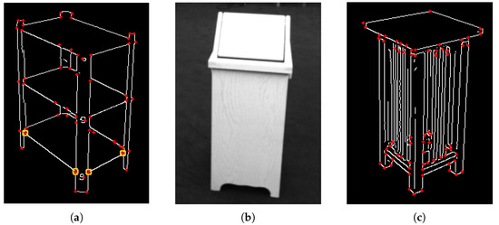 The importance of corner detection. (a) 3D recovery fails unless at least two pairs of corner features appear that reveal the required symmetry planes. In this edge map of an image of the Bookshelf, detected corners are marked in red, and a sufficient set of four corners is marked by yellow circles; (b) degenerate view of the Rubbish Bin. Recovery fails because the back of the object is not visible, and corner detection cannot be used to determine one of the planes of symmetry; and (c) runtime suffers when corner detection produces many corner pairs that generate symmetry hypotheses orthogonal to the floor, as is the case in this image of the Tall Dense Stand. These hypotheses are not filtered out by Equation (8), and runtime tends towards in the number of detected corners. Runtime for this image was 11.48 s.