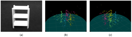 Some 3D recoveries were poor even when symmetry planes were detected correctly. This was due to instabilities caused by degenerate cases inherent in the geometrical foundations of the algorithm. Consider the image of the Bookshelf shown in Figure 11a. The image itself is almost mirror symmetric in 2D, indicating that the symmetry plane contains (or runs close to) the center of perspective projection. As discussed in Section 3.2, this degenerate case prevents recovering 3D depth information from symmetry. As such, 3D recovery must rely on two-view geometry, which, in general, is noisy due to pixelation in the image [22]. However, two-view geometry also has a degenerate case. The Bumblebee2® camera (Point Grey, Richmond, BC, Canada) produces pairs of rectified images [22], which confounds solving binocular correspondence for points on horizontal lines. This means that Equation (4) is not particularly useful in disambiguating symmetry correspondences. Nonetheless, the algorithm produced recognizable output even in this pathological case, as shown in Figure 11b,c.