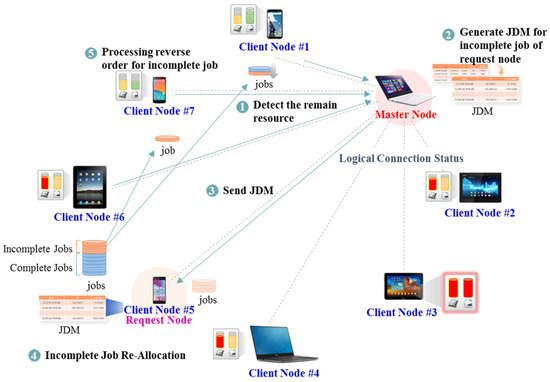 Figure 5 shows the process when an idle resource occurs in the mobile client. In Figure 5-①, the master device detects an idle resource while collecting resource information from mobile clients. As shown in Figure 5-②, a JDM is created for an incomplete job based on the job processing status information that the master device receives. The JDM is sent to the job request device as shown in Figure 5-➂, and the job request device sends the job to the mobile client in a resource idle state as shown in Figure 5-➃. Figure 5-➄ shows that the newly allocated incomplete jobs are processed in reverse order.