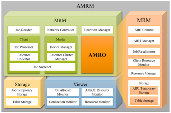 AMRO provides an adaptive mobile resource offloading scheme. The AIRI Counter calculates AIRI which is the average idle resource of the mobile device over 30 s. The ARIT Manager creates and manages the table ARIT, which integrates the AIRI received from the mobile clients with DRI. The Client Resource Monitor receives the AIRI of the mobile clients and determines the job processing speed. If the job processing speed is determined as fast or slow, jobs are reallocated through the Job Re-allocator. The Resource Manager configures the currently available resources considering the DRI and AIRI. The storage of AMRO consists of AIRI Temporary Storage and Table Storage. The AIRI Temporary Storage temporarily stores the AIRI received from each mobile client. The Table Storage temporarily stores the ARIT and JDM.