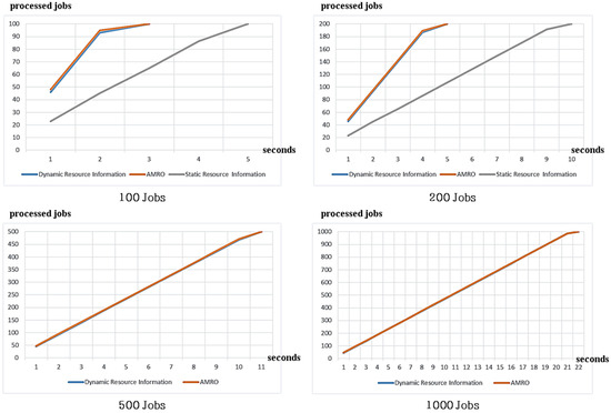 Figure 8 shows a comparison of cases where the mobile device does not run any other processes apart from providing resources to the mobile cloud computing. The times that elapsed during 100, 200, 500, and 1000 jobs in the same mobile cloud environment were measured. In experiments of 500-job and 1000-job processing, 100 and 200 jobs do not exhibit the result of static resource information in Figure 8. The measurements were divided into four units because job processing in a small unit cannot clearly portray the difference in time taken. The static resource information offload method for 500 and 1000 jobs was excluded from the verification because it took too much time compared with the other offload methods. The dynamic resource information offload and the AMRO showed similar processing times, but the static resource information offload was slower and had a less accurate performance measure as compared to the other two offload methods.