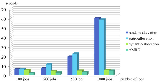 Comparisons according to increasing jobs of random-allocation, static-allocation, dynamic-allocation, and AMRO.