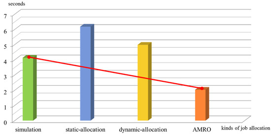 For verification of our execute model of AMRO, 100 jobs was compared to the average value of simulated mobile devices in Figure 11. As shown Figure 11, AMRO is significantly faster than static-allocation and dynamic-allocation and the efficiency of actual execution environment is about 49.08% higher than simulation.