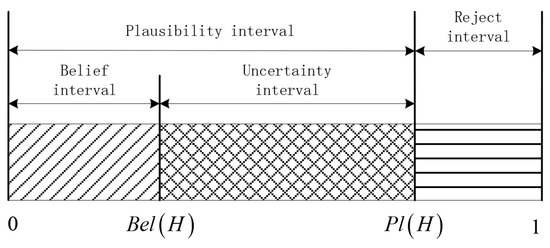 It is easily seen in Equations (5) and (6) that describes the true possibility of proposition H, while expresses the unsuspicious possibility of proposition H. Therefore, and , respectively, present the lower and upper bounds of probability, which forms the uncertainty interval (shown in Figure 1).