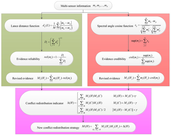 To improve the accuracy, validity and reliability of multi-sensor fusion, the proposed algorithm firstly adopts the Lance distance function and spectral angle cosine function to revise original evidence, respectively, and then employs an improved conflict redistribution strategy to fuse multi-sensor evidence. In addition, the algorithm scheme is illustrated in this section.