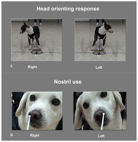 Regarding olfaction, asymmetries in nostril use have been observed during free sniffing behaviour of odorants that differ in terms of emotional valence [,]. Briefly, cotton swabs installed on a digital video camera were used to present odorants to dogs (see Figure 1B). The camera was installed on a tripod in the centre of a large silent room. A frame-by-frame analysis of nostril use video footages revealed a clear right nostril bias during sniffing of clearly arousing odours for dogs (e.g., adrenaline and veterinary sweat). Given that, in dogs, the olfactory nervous fibres, which drive odour information from peripheral receptors to the olfactory cortex, are uncrossed, right nostril use indicates a prevalent right hemisphere activation []. The latter was consistent with the previously reported right hemisphere involvement in analysing alarming/threatening stimuli and had direct implication for dogs’ welfare and training since, for example, the constant use of the right nostril during olfactory inspection of a human being could reveal an increased arousal state of the animal, even in the absence of clear behavioural signs (this could be useful in those activities like animal-assisted therapy in which dogs must possess advanced behavioural control skills in order to help them handle high arousal situations and consequently it is not always easy to detect stress increase directly from behavioural signs).