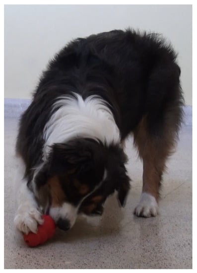 Asymmetries of motor functions have been widely reported in various vertebrate and invertebrate species, including the dog [,]. There is now a growing body of literature on motor lateralization in dogs, focused mainly on behavioural lateralization in the form of forelimb preferential use. In recent studies, paw preference has been assessed using several tasks: removal of a adhesive plaster from the eye [,] or of a piece of tape from the nose [,,,,], removal of a blanket from the head [], retrieval of food [,] from a toy object (namely the “Kong”, see Figure 2) [,,,,] or a metal can [], paw-shaking [], first foot placed forward to depart from a standing or sitting position [,] or during a run [] and stabilization of a ball [] and hindlimb raising behaviour during urination [].