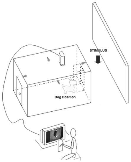 - Studies on behavioural asymmetries associated with lateralized brain functions have usually focused on asymmetric use of paired organs (e.g., forelimbs) but not of a medial organ (i.e., the tail). In order to test asymmetries in tail wagging behaviour, family pet dogs of mixed breeds were placed in a large rectangular wooden box with an opening on the centre of one of its shorter side to allow subjects to view the different stimuli (see Figure 3). Different emotional stimuli were presented as follows: the dog’s owner; an unknown person; an unfamiliar dog with agonistic approach behaviour; and a cat. Tail wagging was analysed frame by frame from video footages recorded through a video camera placed on the ceiling of the box (see Figure 3).