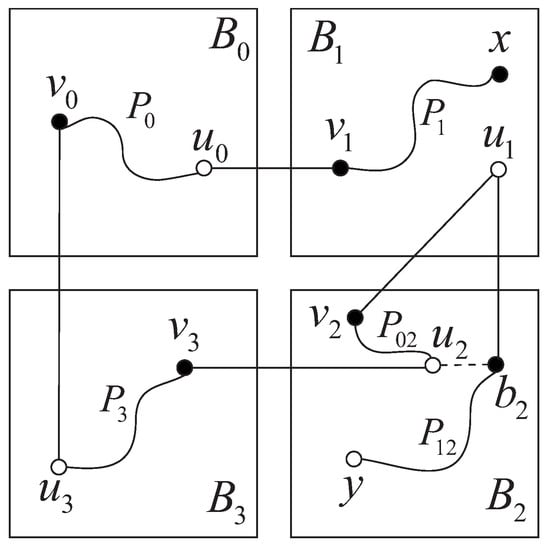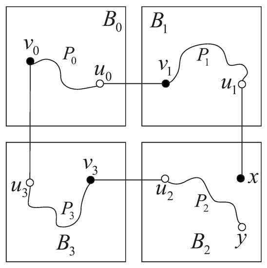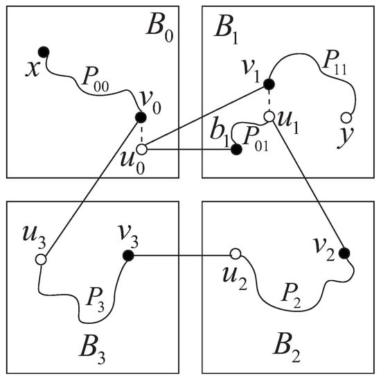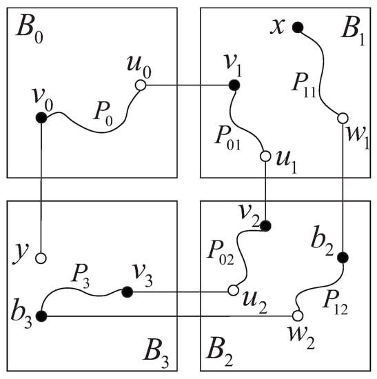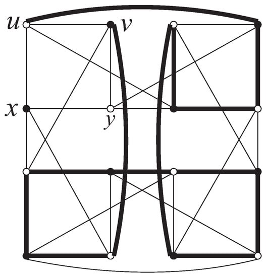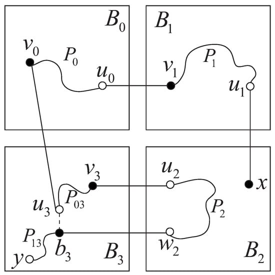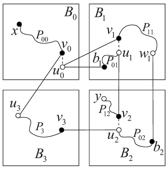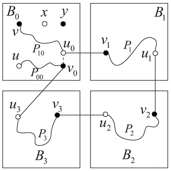 , . Let be a black vertex in . By Lemma 3, there exists a Hamiltonian path of from x to . Furthermore, there exist an edge from to , an edge from to , an edge from to , and an edge from to . Moreover, there exist a Hamiltonian path of from to passing through e, a Hamiltonian path of from to , and a Hamiltonian path of from to . Hence, is a Hamiltonian path of from x to y passing through e (see Figure 9).