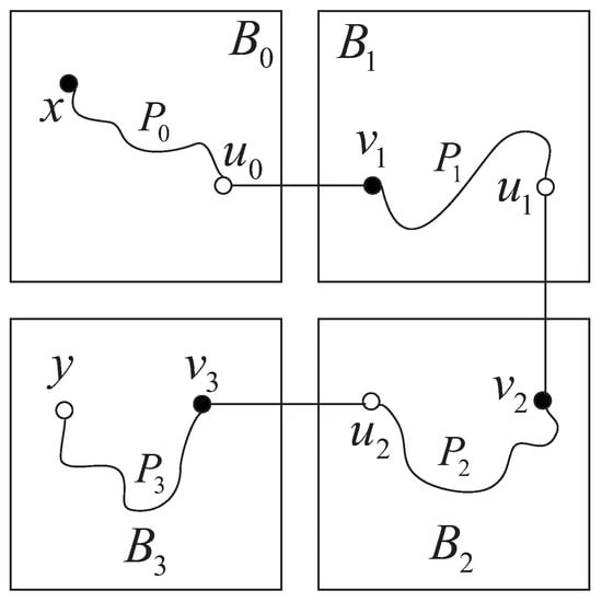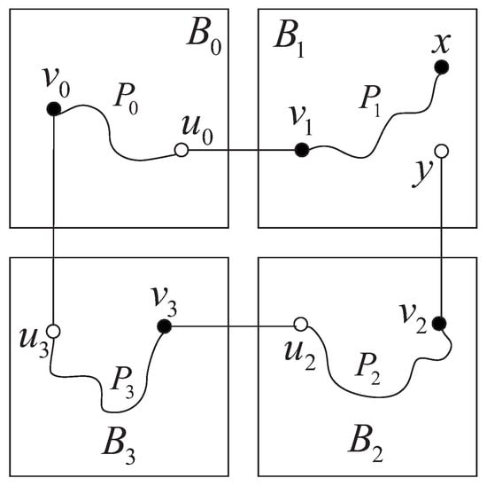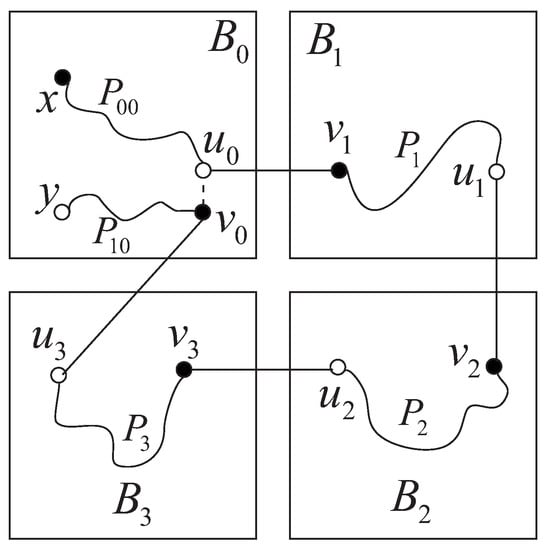 [30] Assume u and x are two different vertices in , and v and y are two different vertices in . Then, there exist two vertex-disjoint paths P and Q such that P joins x to y, Q joins u to v and , where .