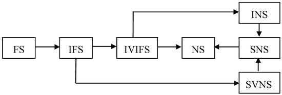Flow chart extended from fuzzy set (FS) to neutrosophic set (NS) (simplified neutrosophic set (SNS), single-valued neutrosophic set (SVNS), interval neutrosophic set (INS)). IFS: intuitionistic fuzzy set; IVIFS: interval-valued intuitionistic fuzzy set.