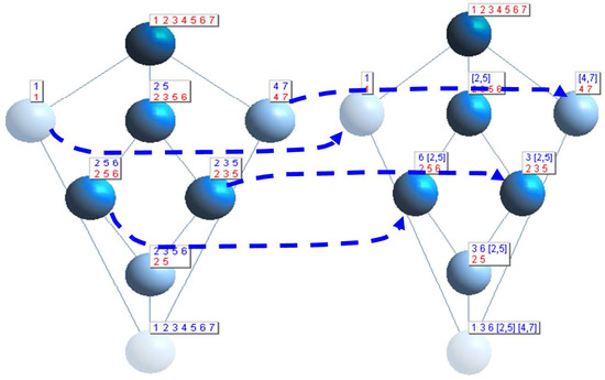 The corresponding concept lattices are generated by the existing concept lattice generation algorithm. The relationship between the concept lattices of the original formal context K (i.e., ) and induced formal context (i.e, ) is shown in Figure 2. According to the findings about the equivalence between equiconcept and clique [9,10], it is clear that the maximal cliques in G include . Interestingly, these maximal cliques are aggregated then represented as the relevant concepts in Figure 2. For example, the common attribute of maximal cliques and is ; that is to say, is the formation base for maximal cliques and .