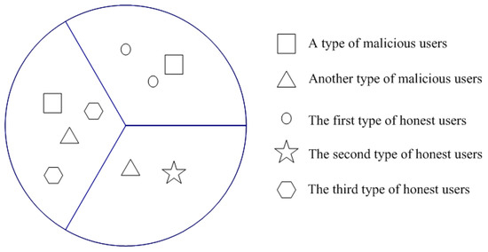 In traditional classification, users are simply divided into honest ones and malicious ones. However, users should not be divided into just two classes (honest and malicious). There are two reasons for this. On the one hand, because shadowing, multi-path fading, and other issues may influence the sensing results, honest users may have different sensing results based on the area in which they are located. Based on the sensing results, honest users should be divided into several classes. On the other hand, as malicious users may act differently from one another, they should also be divided into several classes. Some malicious users are always yes, making other users decide that the channel is being used by PUs. Some malicious users are always no, making other users decide that the channel is idle. There may be another kind of malicious user trying to confuse other users under both channel states. Therefore, it is necessary to classify mobile users into more than two classes. Additionally, mobile users such as smartphones and tablets are being used more and more in our daily life. These mobile users can sense the wireless spectrum. Therefore, spectrum sensing tasks can be assigned to mobile users. This is called the crowdsourcing method.