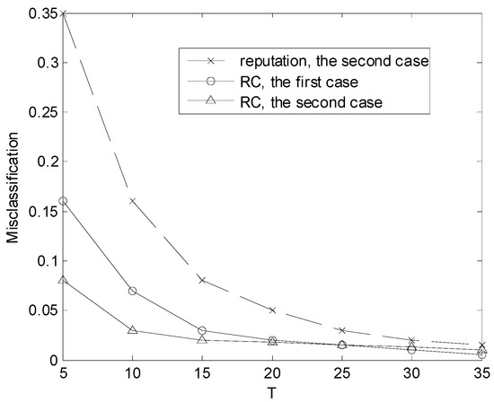 In this section, the results of the distributed algorithm are compared with those of the reputation-based classification [10]. With reputation-based classification, users are classified into two kinds of users (honest and malicious). The reputation method is related to the duration T. That means that the sensing reports in the duration T are collected to evaluate the reputation of users. Based on their reputation, the classification is carried out. The average solution is derived by running the algorithm 500 times. The parameters are described as follows. The sensing region is a circular region with a 100 m radius. The sensing region is equally divided into three sub-regions. All users are located in the region randomly, and employ energy detection. The sensing outcome of each user follows a Gaussian distribution. In each sub-region, the sensing results of mobile users may be different from mobile users’ results in other sub-regions because of multipath fading and shadowing. Therefore, there are three kinds of honest users.