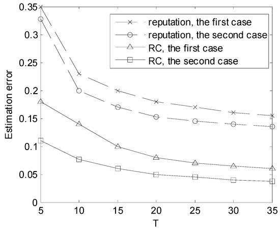The misclassification rate is defined as the ratio of mistakenly judging one kind of user to be another kind. The performance of the classification is shown in Figure 2 and Figure 3. As shown in Figure 2, the misclassification rate varies with T when there are 20 users. Figure 3 depicts the estimation error regarding the channel state when there are 20 users. From Figure 2 and Figure 3, it can be seen that the accuracy of estimation and user classification improves with T and the distributed algorithm (RC) outperforms the reputation-based method. In [10], the authors proposed the reputation-based method to classify users into two kinds. The method is not capable of classifying users into more than two classes. Therefore, there is no misclassification of reputation-based method about the first case in Figure 2.
