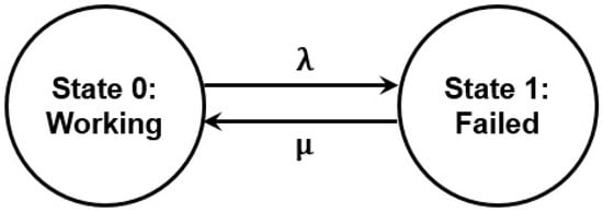 Figure 1 shows a simple state diagram for a repairable framework comprising two basic states, i.e., State 0: Working and State 1: Failed. The arrow going from left to right shows the failure while the recovery is depicted by the arrow going from right to left. Let and denote the failure and repair rates respectively, and and present the framework’s probability for being at a state during any time and the rate of change thereafter, respectively.
