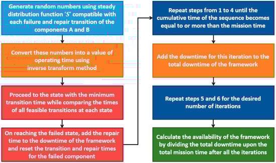 In this technique, initial MC Simulation codes are developed that simulate the working of framework for the complete duration of the specified mission. Afterwards, availability of the framework is calculated for a large number of simulation runs. For the purpose of this research, MC Simulation codes were assessed for a confidence level of 0.95 and a confidence interval of 10−5. The algorithm used for developing the MC Simulation codes is depicted using a flow chart in Figure 4, as below: