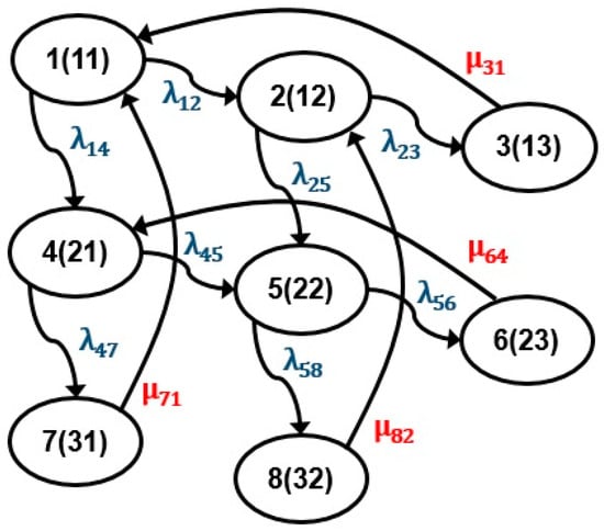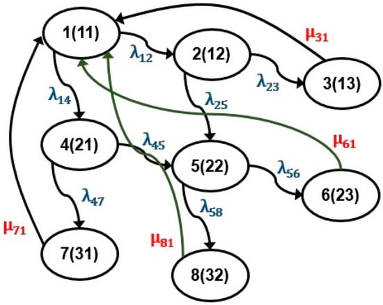 First, state diagrams for the problem are drawn based on the identified failure and repair rates for all the state transitions. State diagrams for perfect repair, with and without opportunistic maintenance, are illustrated in Figure 5 and Figure 6 respectively. In this way, state diagrams for imperfect repair, with and without opportunistic maintenance, can also be drawn. Failure and repair rates for the framework are denoted with the terms and respectively; where index exhibits the state before transition, and state of the framework after transition is exhibited by index . It can be noticed from Figure 5 and Figure 6 below that . Let denotes the framework’s probability for being at state at any interval , then in the light of discussion in Section 2.1 above, DEs for the problem can be formulated from the state diagrams illustrated in Figure 5 and Figure 6. These systems of first-order DEs are enumerated in Appendix A and Appendix B, respectively.