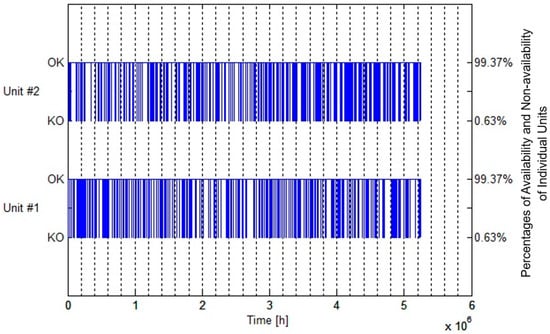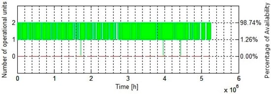 Availability of individual units of the framework over the given time duration is shown in Figure 8 below. Percentage of availability for both the units comes out to be and the individual downtime for each unit appears to be only. It is pertinent to mention that these values are obtained for the framework being monitored under the conditions of opportunistic maintenance using the MC Simulation technique. In addition to the high percentage of combined availability of the framework, even higher values are achieved for the availability of individual units under opportunistic maintenance conditions.