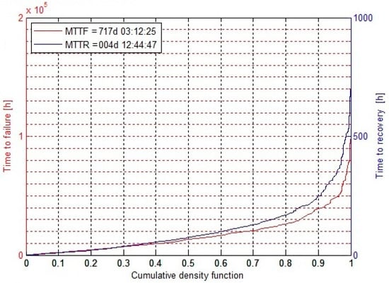 Mean time to failure (MTTF) and mean time to repair (MTTR) are two very important performance indicators as far as availability of a framework is concerned. If these indicators are known, they can be best utilized to calculate the availability. Figure 9 depicts the optimal values for MTTF and MTTR for the framework under an opportunistic maintenance strategy. In this case, these values appears to be and , respectively.