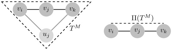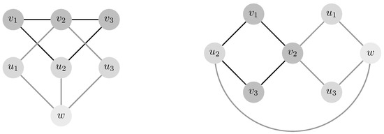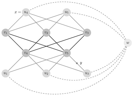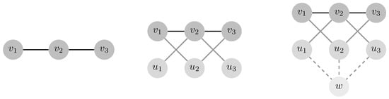 Given a graph G with , the Mycielskian graph of G contains G itself as a subgraph, together with additional vertices , where each vertex is the mirror of the vertex of G and w is the supervertex. Each vertex is connected by an edge to w. In addition, for each edge of G, the Mycielskian graph includes two edges, and (in Figure 1, the process of the construction of the Mycielskian graph for the path graph is shown). Thus, if G has n vertices and m edges, then has vertices and edges.