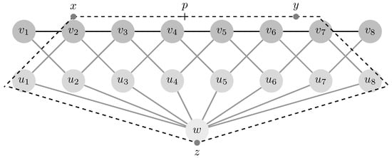 The curve is a geodesic if we have for every (then is equipped with an arc-length parametrization). The metric space X is said to be geodesic if for every couple of points in X, there exists a geodesic joining them; we denote by any geodesic joining x and y; this notation is ambiguous, since in general we do not have the uniqueness of geodesics, but it is very convenient. Consequently, any geodesic metric space is connected. The graph G consists of a collection of vertices, denoted by and a collection of edges joining vertices, ; the edge joining vertices and will be denoted by . Furthermore, will stand for the set of neighbors of (or adjacent to) the vertex , that is the set of all vertices for which . All throughout this paper, the metric space X considered is a graph with every edge of length one. In order to consider a graph G as a geodesic metric space, we identify (by an isometry) any edge with the interval in the real line. Thus, the points in Gare the vertices and the points in the interiors of the edges of G. In this way, any connected graph G has a natural distance defined on its points, induced by taking the shortest paths in G, and we can see G as a metric graph. Such a distance will be denoted by . Throughout this paper, G denotes a connected (finite or infinite) simple (i.e., without loops and multiple edges) graph such that every edge has length one and . These properties guarantee that G is a geodesic metric space and that can be defined. Note that excluding multiple edges and loops is not an important loss of generality, since ([57], Theorems 8 and 10) they reduce the problem of computing the hyperbolicity constant of graphs with multiple edges and/or loops to the study of simple graphs.