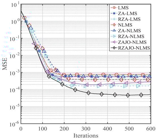 - Lima, M.V.S.; Martins, W.A.; Diniz, P.S.Z. Affine projection algorithms for sparse system identification. In Proceedings of the 2013 IEEE International Conference on Acoustics, Speech and Signal Processing (ICASSP’13), Vancouver, BC, Canada, 26–31 May 2013; pp. 5666–5670. [Google Scholar]