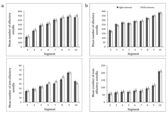 The mean number of olfactory and non-olfactory sensilla with the respective standard error (SE) in function of the segment number for the right antenna (dark grey bars) and for the left antenna (white bars) of (a) O. rufa females (N = 14) and (b) A. australis foragers (N = 14).