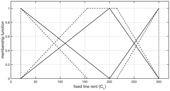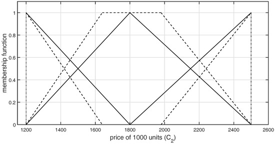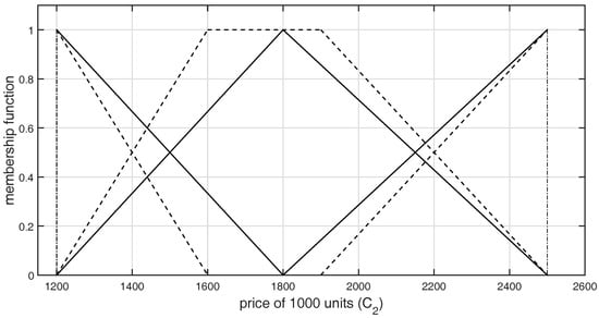 Each alternative activates the specified number of fuzzy rules, where for each one, the fulfillment degree of the conjunctive complex premise is determined. The fulfillment degrees of each activated rule corresponding to each element of always sum to one. Each alternative is a set of crisp numbers, corresponding to criteria . It can be presented as follows: