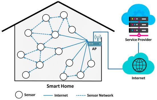 In general, the smart home infrastructure is comprised of a sensor network that has been created with various wireless sensors inside of the home, an AP for connecting the sensor network outside, and a service provider. Figure 1 shows the infrastructure of a typical smart home. Various sensors in the smart home communicate with each other through a sensor network to provide service to, and collect information from, residents. Each of the sensors exchanges information with the service provider through the AP and if a sensor cannot directly reach the AP, it communicates through the other sensors. A smart home sensor network requires a topology for securely and efficiently exchanging information in regards to computing ability and the power capacity of various sensors. However, most of the suggested sensor networks propose various topologies or infrastructures that lack a diversity in sensor ability. Therefore, it is inappropriate to apply them to an actual smart home sensor network.
