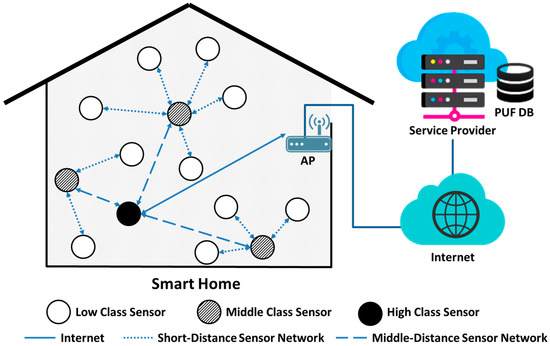 Figure 2 shows the hierarchical topology that is suggested in this paper in consideration of the capabilities of various sensors in a smart home environment. Sensor networks in the smart home have been classified into three classes of low-, middle-, and high-class from sensors with low resources to ones with high resources for the capabilities of each sensor. Low-class sensors are the smallest and most affordable. Therefore, they are distributed the most in the smart home. Middle-class sensors are not distributed as widely as low-class sensors. In addition, high-class sensors have the highest capabilities, and one of them is placed in each smart home. These sensors do not communicate with the one that is nearest, but with the closest high-class sensors, in order to exchange information with service providers. For example, low-class sensors only communicate with the closest middle-class sensor, and middle-class sensors only communicate with the nearest low-class and high-class sensors. Direct communication with the service provider through an AP is only carried out by high-class sensors. Suggested techniques in this paper perform mutual authentication and key agreements, as all the sensors have PUFs, and they implement them for secure communication amongst the layers in each sensor. PUFs are a unique chip that cannot be physically copied. As such, they present a unique challenge-response value. The challenge-response value of each PUF is registered in the server’s PUF DB before sensors are distributed to the field [33,34,35,36]. Values that are used once are removed from the PUF’s DB. Therefore, they cannot be re-used.