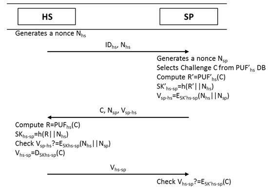 - HS received with C, Nsp, Vsp−hs from SP computes PUFhs(C) and the R value and connects R and Nhs to hash them and create the session key, SKhs-sp = h(R’||Nhs). If the Vsp−hs received from HS is identical with the encrypted value with SKhs−sp in connection with Nsp and Nhs, HS authenticates SP. In addition, the verification value, Vhs−sp = DSKhs−sp(C), is calculated by encrypting the C received from SP with SKhs−sp and is sent to SP.