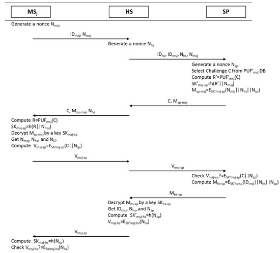 - SP received with Vmsj−sp from MSj through HS encrypts (C||Nsp) with the session key SK’msj−sp. If ESK'msj−sp(C||Nsp) is consistent with Vmsj−sp, MSj is authenticated. In addition, (IDmsj||Nhs||Nsp) is encrypted with the session key, SK’hs−sp and sends Mhs−sp = ESK’hs−sp(IDmsj||Nhs) to HS. The used Challenge C and Response R’ are removed from PUF’msj DB.